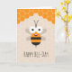 Die Nice Happy Birthday Card bietet eine Cartoon-Illustration von lustigen niedlichen Lächeln Biene auf dem Wabenhintergrund. Der Text im unteren Teil der Karte kann mit den Online-Tools von Zazzle leicht personalisiert werden.
