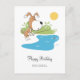 Diese niedliche Happy Birthday Postkarte zeigt eine Kartoonik-Illustration von lustigen Fischen Welpe. Der kleine Hund Angler steht neben dem Wasser mit der Angelstange und wartet auf den Fisch. Die Illustration erfolgt in warmen Farben: braun, grün, gelb und weich blau. Eine tolle Karte, die man an jeden schicken kann, besonders wenn er ein Hundeliebhaber und Angelfreund ist. Sie können den Text einfach mit Zazzle-Tools personalisieren.