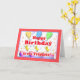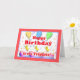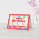 Drei kleine Hühner auf Geburtstagskuchen mit Ballons auf einer Geburtstagskarte für Triplets. Mein innerer Vers ist anpassbar.