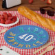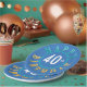 Ein vielseitiges und auffälliges Papier-Plattendesign mit dem kreisförmigen Text "Happy Birthday" in Türkis und Gelb, etwa einer Alterszahl. Ändern Sie die Hintergrundfarbe und das Alter in eine beliebige Farbe mit der bereitgestellten Vorlage.