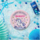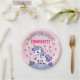 Adorable magische Teller zum Geburtstag zu feiern. Eine rosa Platte mit einem niedlichen Cartoon gezeichnet Einhorn. Sie hat eine bunte Mane und Schwanz in pastellfarbener Blues, pinke und violette, ein gelbes Horn auf der Krone ihres Kopfes, einen weißen Körper und lila Hufe. Sie ist auf lila Gras stehend, mit lila Sträuchern im Hintergrund und umgeben von bunten Sternen. In gebogenem lila Text oben auf dem Teller sind die Worte "Happy Birthday" und darunter in rosa Text ist eine Vorlage, um Ihren Namen zu personalisieren diese niedliche Ergänzung zu Ihren Party Feiern.