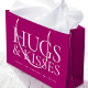 Personalized gift bags add a thoughtful, luxurious touch to any gift. This stylish design features "Hugs & Kisses" in classic typography, and can be customized with the recipient's name and a "Happy Birthday Day" message — perfect for milestone birthdays including 18th, 21st, 30th, 40th, 50th and 60th. This elegant template can be adapted for Valentine's Day, a bridal shower, bachelorette party, holiday, and other special occasions. A unique addition to your gift wrap, and a lovely choice for a girlfriend, boyfriend, husband, wife, daughter, or best friend. Available in either a matte or glossy finish. Printed colors: dark pink and white, or customize the colors with the design tool.