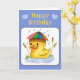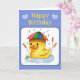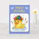 Niedliches gelbes Entlein schwimmen auf einem Teich im Regen mit einem farbenfrohen Schirmhut. Auf der Vorderseite der Karte über der Abbildung sind die Worte Happy Birthday in gelbem Text. Ein blasses Herz für Liebe ist Set auf beiden Seiten des Geburtstags Wunsch auf blauem Hintergrund. Das gleiche Enckling wird auf der Innenseite und auf der Rückseite der Karte angezeigt. Die Innenseite hat eine Vorlage zu verwenden, wie es ist, oder ändern Sie zu Ihrer eigenen Geburtstagsnachricht.