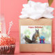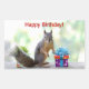 Foto eines niedlichen Eichhörnchens, das neben zwei kleinen Geschenkartikeln stehend ist und direkt auf die Kamera schaut. "Happy Birthday!" ist der rote Titel.