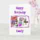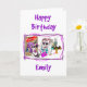 Herzlichen Glückwunsch zum Geburtstag - Emily - Lila Text und Cartoon von Mädchen, die einkaufen gehen.