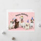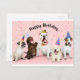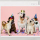 Eine fröhliche Szene von fünf spielerischen Hunden mit bunten Party Hüten, umgeben von Konfetti. Die Hunde bellen und spielen, fangen ihre Spannung und Energie ein.