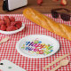 A bright and cheerful “Happy Birthday” plate bursting with color and celebration. The bold rainbow‑gradient lettering takes center stage, surrounded by playful balloons, stars, and swirling streamers in vibrant reds, blues, yellows, and greens. The crisp white background keeps everything clean and festive, making it an easy match for any party theme. Perfect for birthdays of all ages and a fun way to add instant joy to the table.
