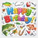 Colorful "Happy Birthday" text surrounded by fishing-themed items like hooks, fish, and bobbers, featuring a cheerful and playful design