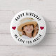 Spaß und moderne Foto Happy Birthday Tasten mit benutzerdefinierten Nachrichten und Foto. Trendy Runddesign mit minimalistischen Herzen und Typografie.