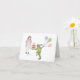 Der kleine Frosch ist so aufgeregt, seinem Freund einen mattierten Kuchen mit einer Erdbeere zu präsentieren. Das kleine Mädchen trägt rosa Polka gepunktetes Kleid, Kniesocken und einen rosa Pullover. Sie hat sich in den Haaren verbeugt. Der Frosch hat den Kuchen, er trägt einen Hut und hat vier Ballons für seine besondere Überraschung.