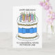 Ein großer Cartoon-Kuchen mit einem blauen Bogen um ihn herum, begleitet von dem Text "Glücklicher Geburtstag zu einer wunderbaren zukünftigen Mutter im Gesetz".
