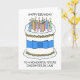 Eine Cartoon-Abbildung eines Kuchens mit hellen Kerzen, begleitet von den Worten "Glücklich zum Geburtstag zu einer wunderbaren zukünftigen Tochter im Gesetz".