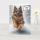 Ein fröhlicher deutscher Hirte schwebt durch einen winterlichen Waldweg, der den weichen Schnee beim Vorwärtsrennen in die Höhe treibt. Text kann geändert werden.
