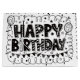 Eine weiße Geschentktüte mit schwarzer Beschriftung, auf der "Happy Birthday" steht und verschiedenen schwarzen Kritzeleien. Die Tüte ist aus glänzendem Papier gefertigt und hat weiße Seilgriffe. Die Beschriftung ist fett und stilisiert, wobei jeder Buchstabe mit unterschiedlichen Mustern wie Sternen, Punkten und Streifen gefüllt ist. Zu den Kritzeleien gehören Luftballons, Sterne, Kreise und wellige Linien, die ein festliches und feierliches Design erzeugen. Die Tüte ist gut beleuchtet, wodurch der Kontrast zwischen dem weißen Hintergrund und den schwarzen Grafiken hervorgehoben wird.
