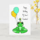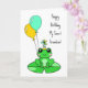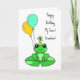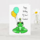 Geburtskarte. Personalisierte Geburtstagskarte mit niedlichem Frosch auf einem Lilienpolster in einem Geburtstagshut mit Ballons.