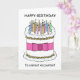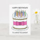 Ein großer Cartoon Geburtstagskuchen mit vielen mehrfarbigen Kerzen, die beleuchtet sind. Das Bild wird von dem Text "Happy Birthday zu einem großen Buchhalter" begleitet.