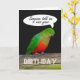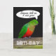 Ein grüner und roter König Papagei, sitzend auf einer Schiene mit schwarzem Hintergrund.Es gibt eine Sprechblase, die lautet: " Einige haben mir gesagt, es war dein ..." und am Ende in den Hauptstädte " GEBURTSTAG. Es ist innen leer.