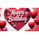 Herzlichen Glückwunsch zum Geburtstag in einem stilisierten, dekorativen Schriftart mit hübschen Ballons und rotem Hintergrund.