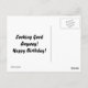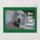 Das niedliche Foto eines Hundes, der frage: "Dein heutiges Alter?" wird auf der Vorderseite dieser Postkarte gezeigt. Auf der Rückseite der Postkarte liegt der Wunsch nach einem guten Geburtstag. Eine tolle Möglichkeit, einen kleinen Spaß zu verschicken!