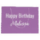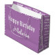 Die Geburtstagsgeschenktasche ist Lavendel. Der Name des Empfängers ist in einem weißen Skript enthalten. Glücklich Geburtstag ist über dem Drehbuch. Der Name (Shown: Melissa) erscheint in elegantem Skript. Der andere Text ist auch weiß. Der gesamte Text kann bearbeitet werden.