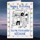 Mechanic arbeitet an der Reparatur eines Autos. Reparaturen an Autos. Cartoon einer Werkstatt zum Thema Automobil. Personalisieren Sie Ihre persönlichen Daten und Ihre Nachricht. Geburtskarte für einen Mechaniker.