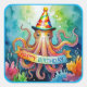 Happy Birthday Octopus Party Hat Watercolor Design Quadratischer Aufkleber
