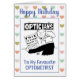 Optometrist cartoon. Optician gives customer a bill which resembles an eye test chart. Personalise with your own details and message. Birthday card for an optometrist.