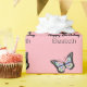 Dieses rosa Geburtstagsblatt hat schwarzen Bildschirmtext, den Sie bearbeiten können, um den entsprechenden Namen anzuzeigen. Über dem Namen befindet sich eine weitere Zeile schwarzen Bildschirmtextes für eine benutzerdefinierte Meldung (angezeigt: Herzlichen Glückwunsch zum Geburtstag). Ein mehrfarbiger Schmetterling liegt über dem Text.