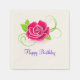 Eine Geburtstagserviette mit einer einfachen Abbildung einer rosa Rose mit grünen Blütenblättern und einem Wirblen Stamm.