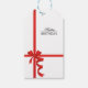 Schönes und elegantes Geschenktag für Geburtstagsgeschenke und -geschenke. Das Design zeigt ein rotes Band auf weißem Hintergrund und den Text "Happy Birthday". Auf der Rückseite der Karte befindet sich eine Zeile aus: und To:, um die Namen des Schenkengebers und des Geschenkempfängers hinzuzufügen.