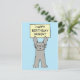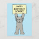 Eine graue Katze mit ihren Vorderpfoten hoch in der Luft und hält ein lemonfarbenes Schild auf, auf dem steht: "Happy Birthday Robert".