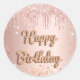 Ein Aufkleber für eine mädchenhafte und glamouröse Geburtstagsparty. Ein Imitat Rose gold metallische Hintergrund mit einem eleganten Imitat Rose Gold und rosa Glitzer Tropfen, Farbe Tropfen aussehen. Der Text: Happy Birthday ist mit einem goldenen ballon Stil Schriftart geschrieben.