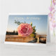 Happy Birthday, May your day be as beautiful as you are. Rose auf Geländer mit Himmel im Hintergrund.