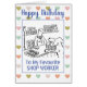 Cartoon des Vertriebsassistenten. In einem Heimtierladen hat ein Hund einen Warenkorb als Kunde. Personalisieren Sie Ihre persönlichen Daten und Ihre Nachricht. Geburtstagskarte für einen Ladenarbeiter oder Einzelhandelsassistenten, der in einem Geschäft arbeitet.