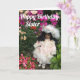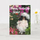 Eine niedliche schwarze Puppe im Viktorianischen Stil Kleid unter den Blume mit dem Text Happy Birthday Schwester.