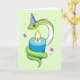 Diese farbenfrohe, handgezeichnet Schlangenkarte wäre für jeden Freund oder Verwandten perfekt. Happy grüne Schlange zeichnend in blauem und rosa Party, umhüllt von blauer Kerze und umgeben von fallenden rosa und blauen Konfetti.