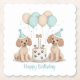 Niedliche Cartoon-Abbildung von Standard Poodle Hunden, die einen Geburtstagskuchen und Ballons umgeben. Ideal für Liebhaber von Haustieren oder Hundeeltern.