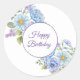 Kleiner runder Geburtstagsaufkleber mit einem hübschen blauen und lila Blumendruck. Anpassen oder kaufen, wie es ist. Stock Print freepik.com