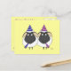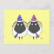 Postkarte mit zwei bezaubernden Schafen in Party Hüten mit Hörnern. Auf der Grußkarte steht: "Happy Birthday Two Ewe!" Der Hintergrund wird als gelbe Farbe angezeigt, aber er und der Schriftart und die Phrase können leicht an das angepasst werden, was man möchte.