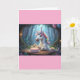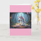 This magical birthday card features a whimsical illustration of a graceful unicorn seated at a table, with a festive birthday cake topped with candles right in front of her.