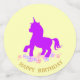 Schöne Tischkonfetti mit Happy Birthday Einhorn auf gelben und ultra violetten Hintergründen. Der Text "Happy Birthday" kann personalisiert sein. Ideal für zauberhafte Geburtstage, Duschen und andere Party-Feste!!!