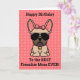Franzosen, zeigen Sie Ihrer Mama etwas Liebe ihren Geburtstag mit einer personalisierten Karte nur von Ihnen. Die Meldung auf der Vorderseite der Karte lautet: "Herzlichen Glückwunsch zum Geburtstag zur besten französischen Mama aller Zeiten!" In der Nachricht steht: "Ich Liebe dir mehr als Leckereien, Happy Birthday." Das Design zeigt eine niedliche Cartoon-Darstellung eines hellbraunen französischen Bulldoggen mit einem rosa Bogen und Kragen. Schriftart- und Hintergrundfarbe ändern und durch Auswahl von "Klicken Sie, um weitere Anpassungen vorzunehmen" ändern.
