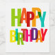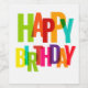 Ein lebendiges Geburtstagsschild mit den Worten "Happy Birthday" in fetten, farbenfrohen Buchstaben. Jeder Buchstabe zeigt eine andere helle Farbe und schafft eine festliche und fröhliche Atmosphäre. Das Tag ist mit einem sauberen, weißen Hintergrund entworfen.