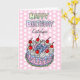 Pink, blau und gelb polka Punkt whimsical Hand gezeichnet Geburtstagstorte mit Kirschen Pop Art Style Geburtstagskuchen Happy Geburtstagskarte.