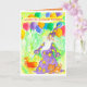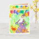 Eine farbenfrohe Geburtstagskarte mit einem whimsikischen Zauberer und seinem Hund, die ein lustiges Geschenk mit farbenfrohen Ballons illustriert mit Aquarellfarbe zaubert.