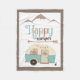 Niedliche digitale Kunst mit "Happy Camper" Text, Boho Stil Pfeil, Berg-Silhouette und Retro-Stil RV Trailer