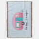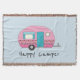Pink RV Trailer Illustration mit "Happy Camper" Text auf hellblauem Hintergrund