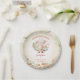 Niedliche Camping-Papier-Teller für den 1. Geburtstag eines kleinen Mädchens mit dem niedlichsten kleinen Bären, Ballons, Van und Bergen in rosa und beruhigenden Farben. Es fängt den Spaß in der Sonne auf Ihrem Hinterhof Grillen, Picknick, Berge oder jede Outdoor Geburtstagsparty ein :) Einfach personalisieren Sie den gesamten Text. - Kate Eden Art.
