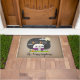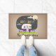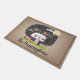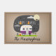 Lila und weißer Wohnwagen, der mit Spinne, Spinnennetzen, Süßmais, schwarzer Katze, Skelettflamingos, Grabstein, Schwarzkatze und Kürbislaterne unter einem Himmel mit Sternen, Vollmond und Fledermäusen verziert ist. Text sagt: "Happy Campers"