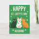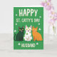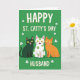 This card shows three cartoon-like cats sitting side by side on a deep emerald green background, giving the scene a festive St. Patrick’s Day look ☘️. One cat is dark green, the middle cat is white with green polka dots, and the third is orange, and they lean close enough to feel like a friendly little group photo. Their big yellow eyes and wide toothy grins—with tiny pink tongues showing—make them look like they’re sharing an inside joke with the person reading. Small white shamrocks are scattered around them, like confetti floating across the green field 💚. Across the top, large white all-caps text reads “HAPPY ST. CATTY’S DAY,” with a soft golden-yellow shadow that helps it stand out. Along the bottom, the same white all-caps lettering says “HUSBAND,” also edged with that golden-yellow shadow. The cats sit centered beneath the top line and above the bottom word, while the white shamrocks dot the open space around them.